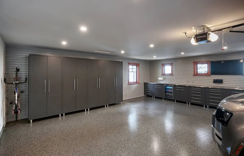 Modern storage systems—slatwall, cabinetry, bike lifts, ceiling racks—turn chaos into order.