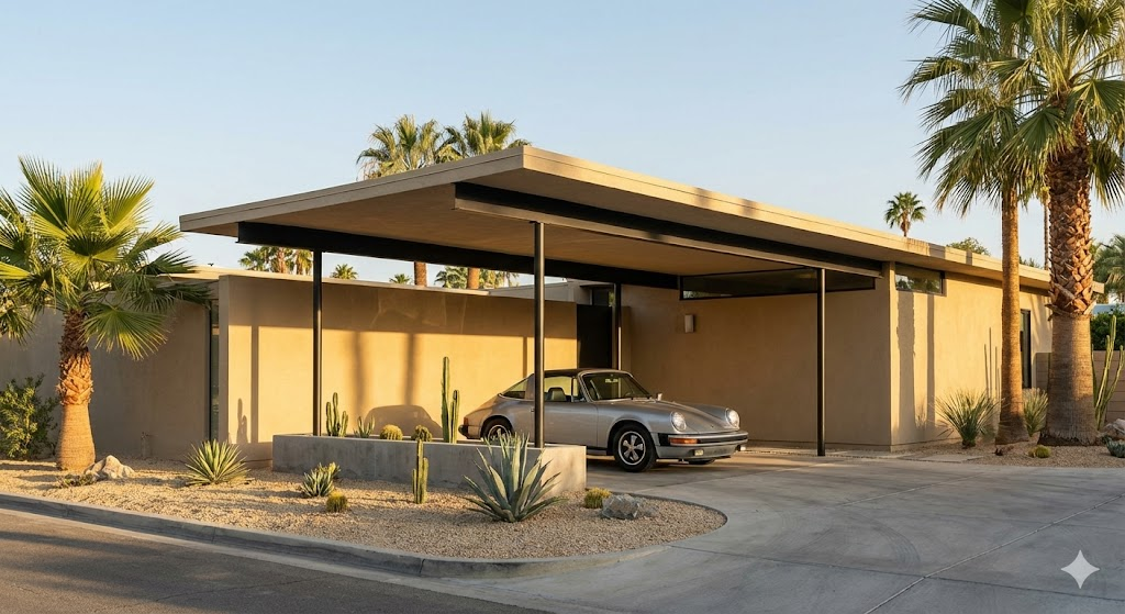In many midcentury modern designs, the carport serves as the primary arrival point. By positioning the main entryway directly off the carport, you bridge the gap between indoor and outdoor living. It offers the same “dry entry” convenience of a garage but keeps the facade feeling open and airy.