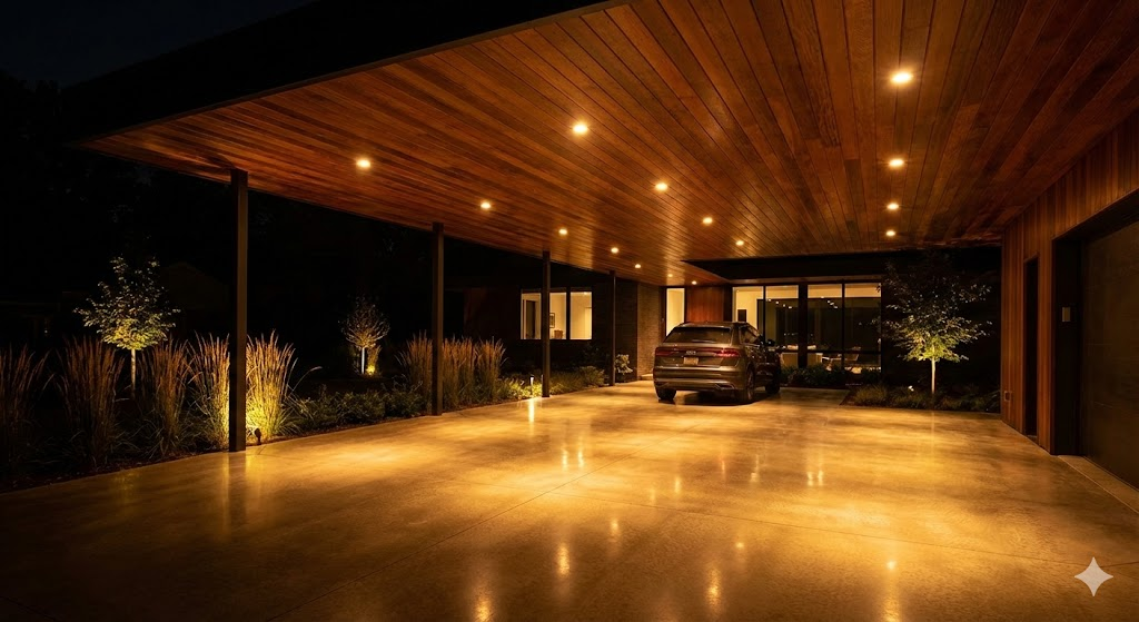 A dark carport is uninviting and unsafe. Install recessed lighting (can lights) into the ceiling of the carport. This turns a utilitarian space into a polished architectural element, perfect for when you have guests or need to take the trash out at night.