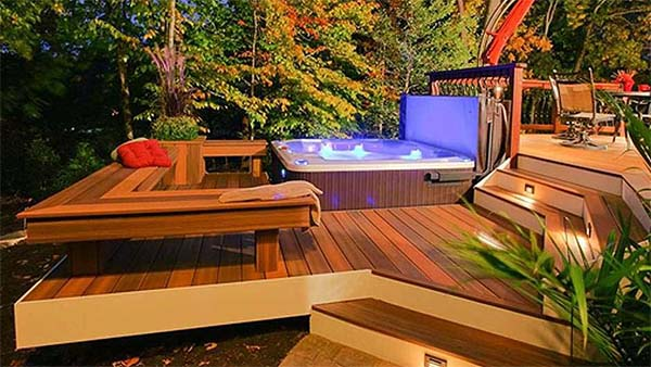 Combining shelter and luxury, this design allows you to enjoy a hot tub in comfort, rain or shine.