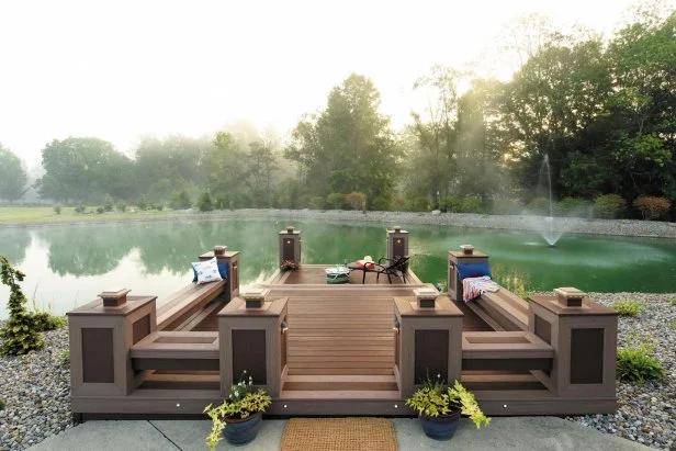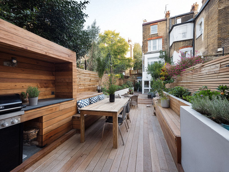 Built-in benches and planter boxes maximize function while adding greenery, making this a smart choice for smaller decks.