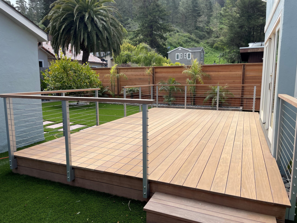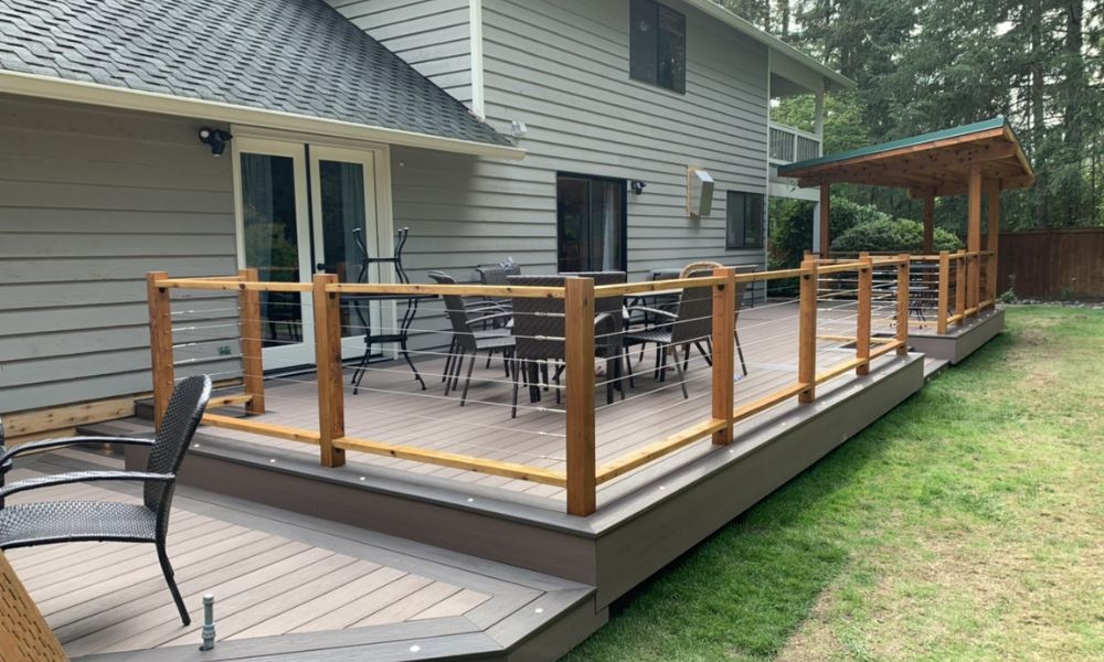 A sleek, modern multi-level deck with black metal railings and integrated stair lighting creates visual interest while maximizing usable space. Perfect for entertaining and separating dining, lounging, and traffic areas.