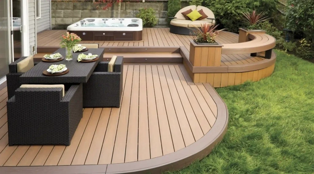 This compact deck design blends relaxation and functionality with a built-in hot tub and small bar seating—ideal for winding down in the evenings or hosting intimate gatherings.