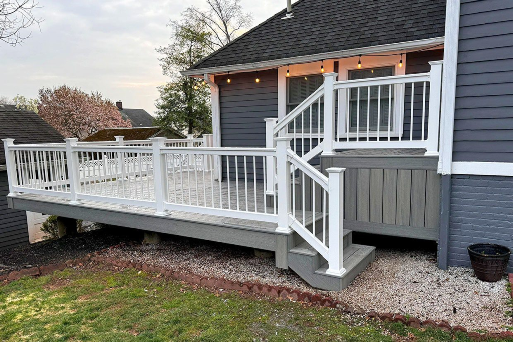 A compact deck using gray composite boards and simple black railings proves that even small outdoor spaces can feel stylish and intentional.
