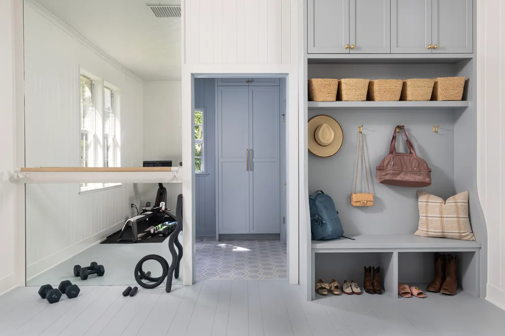 While paint and trim define the space visually, the functionality of a mudroom comes from its storage features.