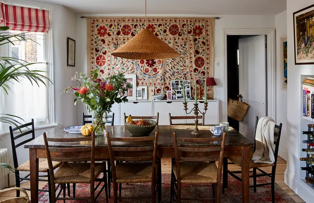 Antique suzanis, tapestries, and rugs naturally complement period architecture, adding depth and continuity to older buildings.
