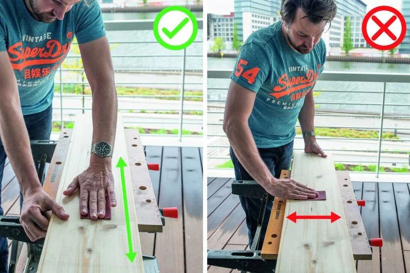 Sanding against the grain creates visible scratch marks that show through stain and even paint.