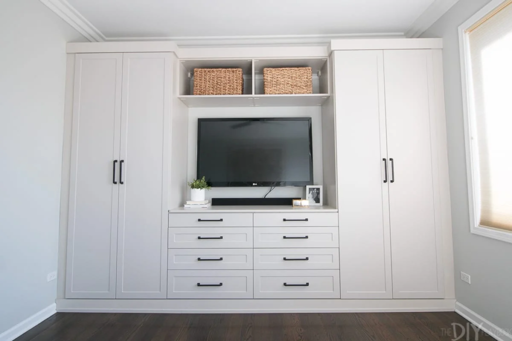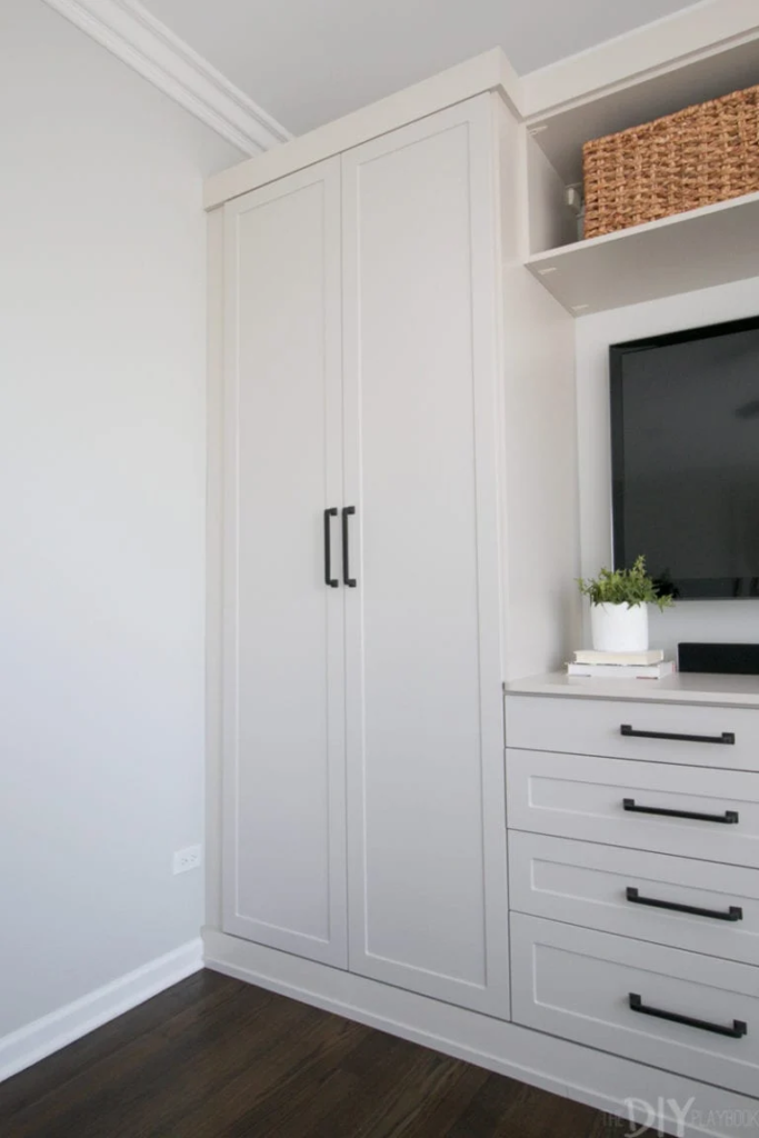 From the beginning, my mom envisioned a full wall of built-in cabinetry. Not open shelves like we used in the living room, but true cabinets—deep drawers, tall wardrobes, and tons of concealed storage.