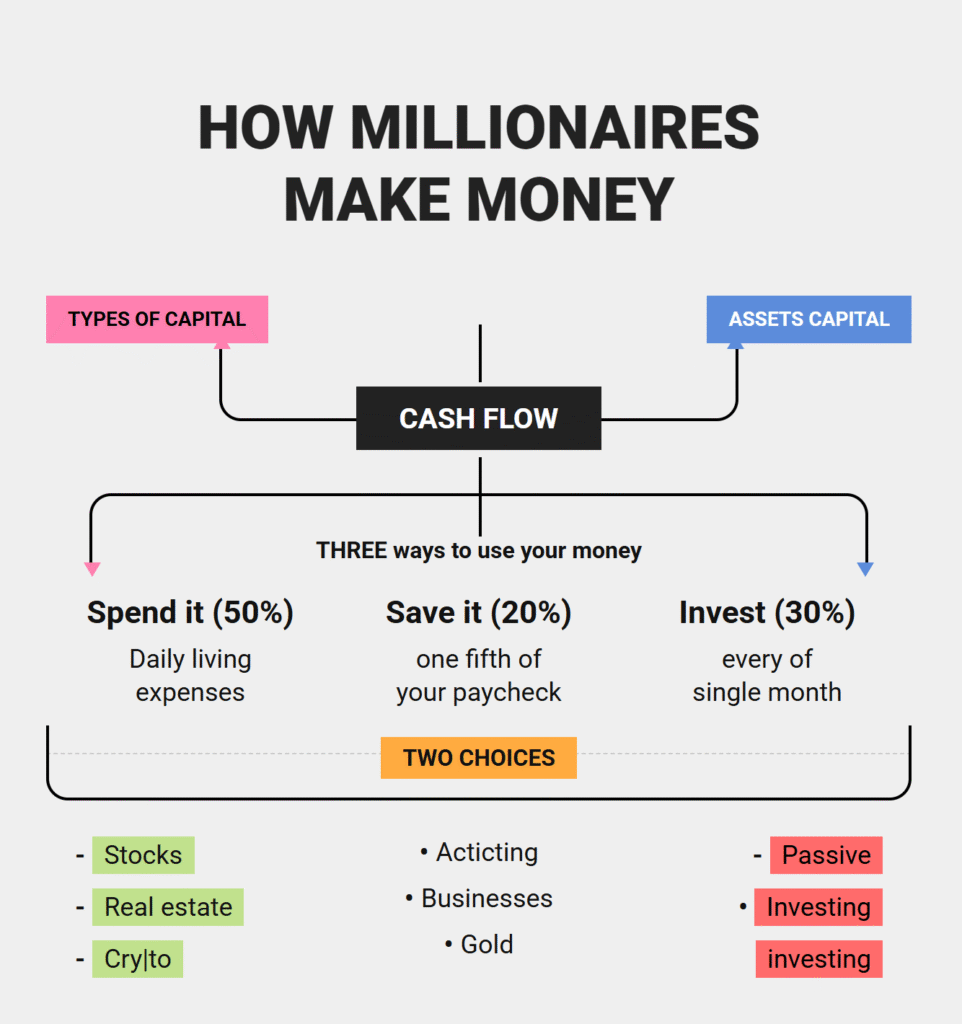 The infographic “How Millionaires Make Money” is not really about making money—it is about managing resources. It simplifies complex financial engineering into a three-step process:
