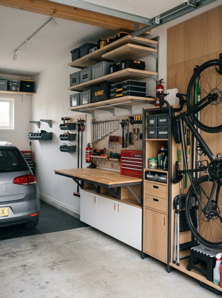 This is one of the most impactful upgrades for tiny garages—especially if you still want a DIY workspace.