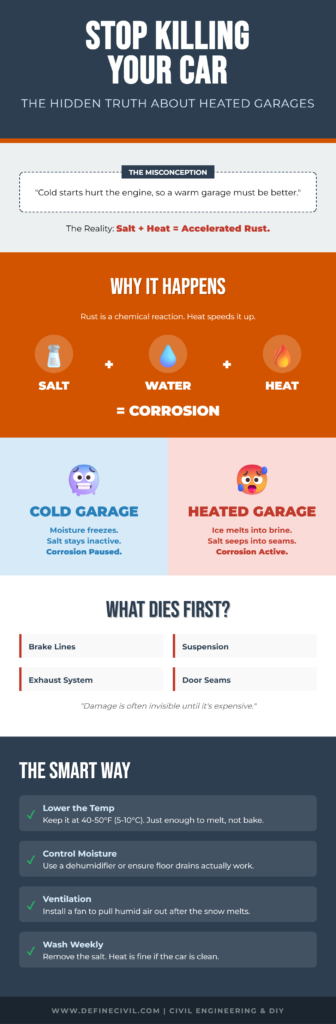 👉 Parking your car in a heated garage during winter can quietly damage your vehicle, your garage, and even your home.